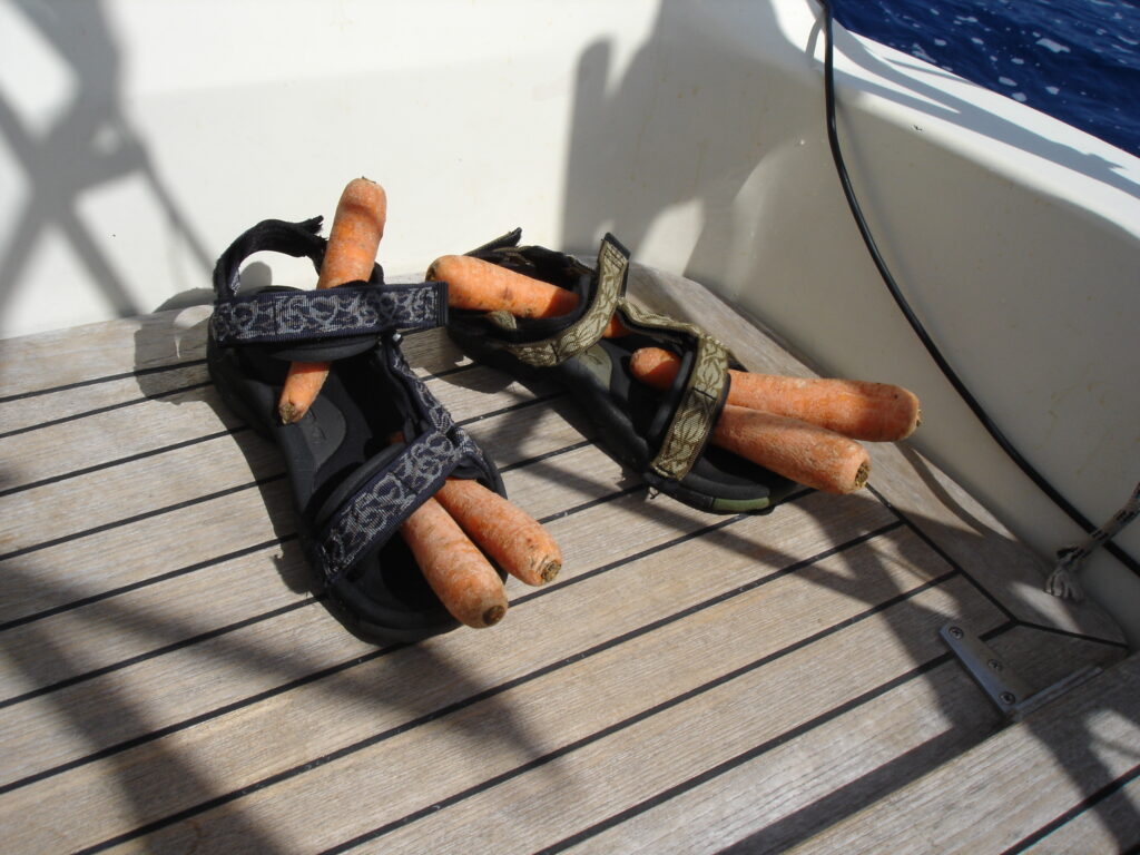 Op die manier kruisen we de koers van Michael en Ilona en kunnen we weer gelijk opzeilen. Deze ruime koers vaart heerlijk en we hebben er weer helemaal zin in. ’s Middags op de punt een zoutwaterdouche genomen. Het water is hier al lekker warm (27,2 graden) en een puts over je heen is een heerlijke afkoeling. Even inzepen met speciale zoutwatershampoo en afspoelen met zoet water uit de douchezak.
