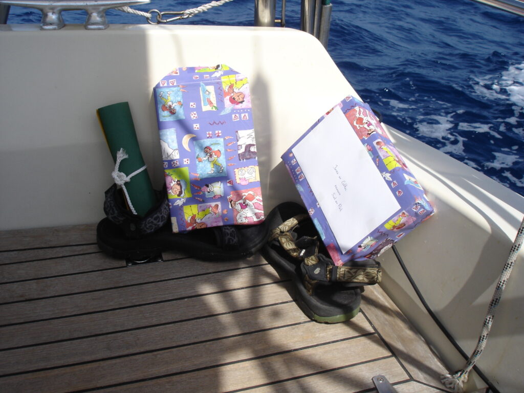 Het is vandaag sinterklaas en de Catch22 en wij hebben cadeautjes voor elkaar gekocht en gedichten geschreven. Van Piet en Dien zat er ook nog iets in de Teva’s. We hebben de sinterklaasliedjes weer opgehaald, want we zouden ’s middags via de SSB voor kleine Menno van de Noorderzon gaan zingen. Dit is er echter niet van gekomen omdat hij op de afgesproken tijd lag te slapen, maar we hebben wel via de marifoon voor Michael en Ilona gezongen.