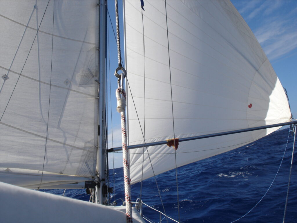 Vandaag was het een zeer knobbelig zeetje. Esther is een beetje grieperig en werd niet vrolijk van deze combinatie. Veel geslapen en ’s avonds ging het weer een stuk beter. De hele dag hebben we voor de wind gevaren en de windvaanstuurinrichting deed zijn werk perfect. Van de andere boten horen we (en dit wordt door onze gripfiles bevestigd) dat we een gebied met windstilte naderen. Nou ja, daar hebben we de motor voor, en het schijnt dat na de 40ste lengtegraad de passaatwind echt waait.