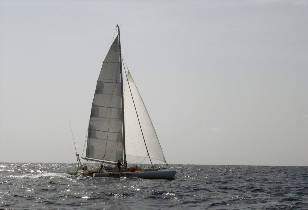 Vandaag kwam er een 45-voet lange trimaran voorbijgeschoten. Het was een Nederlander en we hebben even via de marifoon gekletst. Toen ik naar buiten kwam om een foto te maken, was hij alweer voorbij. Zijn grootste dagafstand deze reis was 280 mijl – ongelooflijk snel!